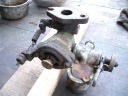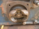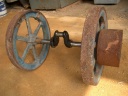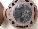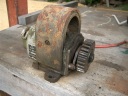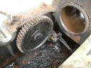 先ずキャブレターからはずします。ボルトは錆び付いているので折れないようにCRCを吹きつけ、充分浸透してからの作業です。折れたら近くの日曜大工センターで、というわけには行かないのです。ねじの切り込みのピッチが違います。次にシリンダーヘッドを抜き取ります。これも、太いボルトが4本、ヘッドを貫通しています。ヘッドをはずすとバルブの周辺、ピストンの頭にはびっしりと50年間のカーボンがついています。次にピストンのコネクティングロッドをはずし、ピストンを抜いてしまいます。そして、はずみ車の軸受けのメタルの押さえをはずし、はずみ車を取り除きます。この時注意しなければならないのは、マグネトとシャフトとプッシュロッド機構部の3つの歯車の噛み合っている位置です。これを記憶しておかないと、吸入−圧縮−爆発−排気のタイミングが取れなくなります。新しい発動機の歯車には、合わせマークが打っているものもあります。カバナーのカバーもはずします。そうしてバラした部品は石油に浸け、ブラシでこすり、徹底的に錆と汚れを取り除きます。真っ黒になった石油パンの底に、小さな部品が残っている時があり、無くさないようにしなければなりません。石油で洗った後は、エアダスターで吹き飛ばします。時々、部品ごと飛ばしてしまい、小さな部品を見つけるために何時間もかけたことがあります。何しろ、作業場は半分外で小石もあれば草も生えています。錆落としには恰好の場所なんですが・・・・。