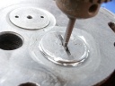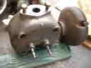 ヘッド周りはカーボンを落とした後、バルブの摺り合わせをします。これをやっておかないと圧縮漏れを起こしたりして、馬力が出ません。ドリルの先にマイナスドライバーを付け、バルブのマイナスの凹みに合わせ、摺り合わせ面に研磨剤を着けて回転させます。材質が硬いのでなかなか密着しません。また、オイラーとかカップグリスの蓋、燃料コックのつまみやレバーなどは真鍮製なので汚れを落とした後に、ドリルの先に真鍮ブラシをつけたものでパフをかけます。すると、真鍮独特の輝きを取り戻します。銘板も同じです。ボルト1本、小物品は手間を惜しまずに磨きあげないと、仕上がりの見栄えが悪くなります。