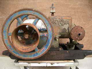 私のところへやって来た時は、上の写真のようにみすぼらしいかっこうでした。はずみ車を持って回すと、少しピストンの抵抗があり、圧縮は弱いもののなんとかなりそうな感じでした。幸いなことに欠品がありません。50年も前のものですから、欠品があると部品を手作りしなければなりません。銘板は真鍮製で真っ黒になっていましたが、共和農機製作所と読み取れました。